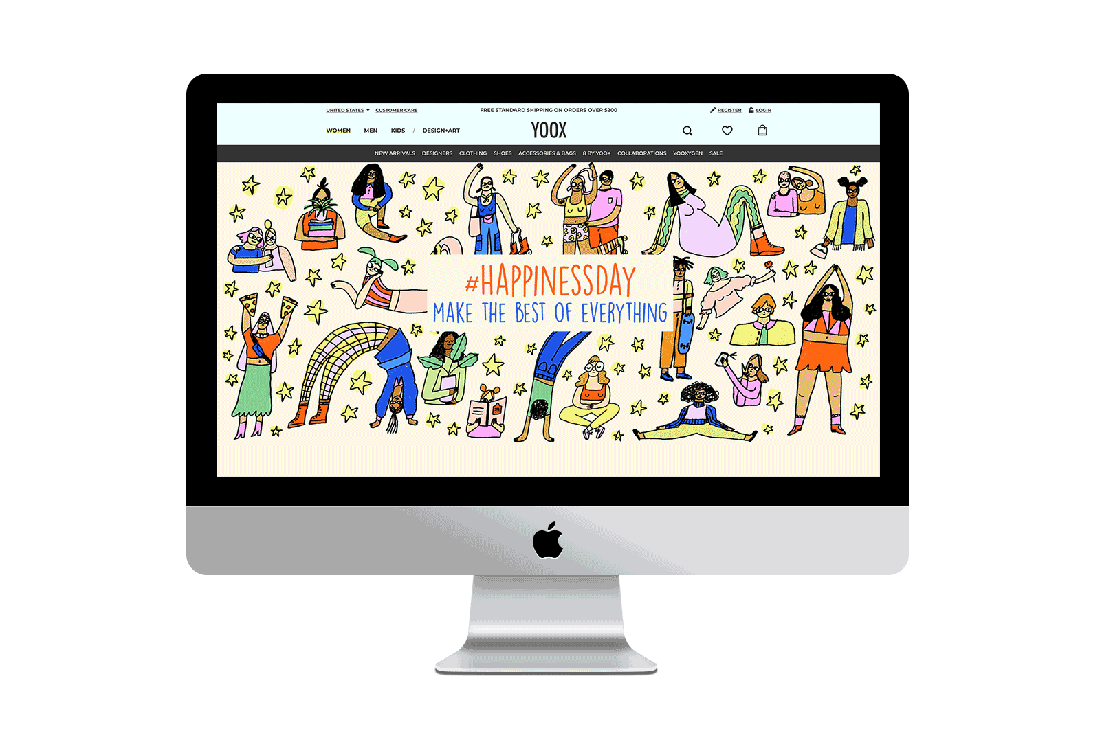 Illustrations and custom IG face filter for YOOX Happiness Day featured on their homepage, newsletter, and social media channels.